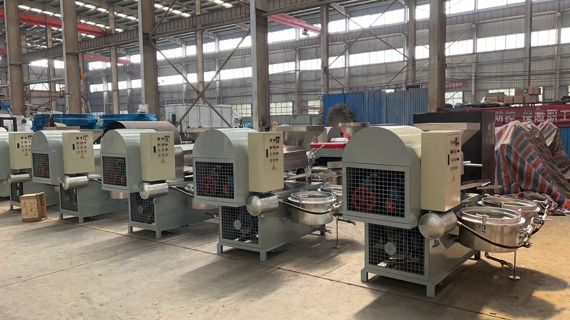 7.新榨油機(jī)安裝后進(jìn)行4—8小時(shí)磨榨,方法是用已榨干油的餅料從料斗中緩緩喂入,反復(fù)回榨,使榨膛磨光,切記開始磨榨不要將料直接倒入料斗內(nèi),而以手抓喂入為宜,以防榨螺軸卡死。如喂料過猛,榨膛內(nèi)出現(xiàn)異常響聲或榨螺軸卡死,應(yīng)立即停車,消除梗阻,或重新裝配好后再啟動(dòng)磨榨,嚴(yán)禁強(qiáng)行拖車。8.正常榨油時(shí),必須保持進(jìn)料均勻,切勿過多過少或斷料空轉(zhuǎn)。此時(shí)機(jī)器負(fù)荷正常,運(yùn)轉(zhuǎn)平穩(wěn),響聲有節(jié)奏。出餅順暢,低壓段基本無渣,高壓段有少量油渣,但渣在油中的比例不大于10%,榨膛內(nèi)溫度可達(dá)150—200℃,出餅口出冒出青煙應(yīng)通過護(hù)罩由抽煙管排出。榨出熱餅要及時(shí)攤開,不要急于打堆或裝運(yùn),否則會(huì)產(chǎn)生自然現(xiàn)象。當(dāng)連續(xù)工作時(shí)間較長,機(jī)溫過高時(shí),應(yīng)采取電扇吹風(fēng)等降溫措施。